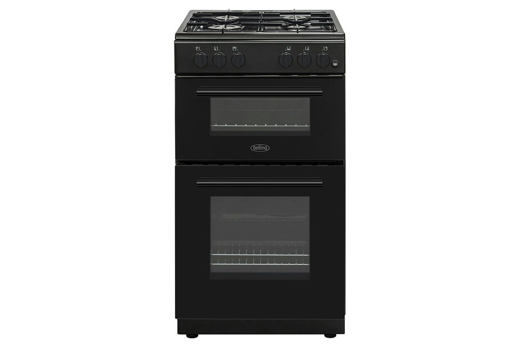 The Belling BFSG51TCBKLPG is a 50 cm freestanding LPG gas cooker designed for compact spaces. It features twin ovens—a spacious main oven and a separate top grill oven—offering versatile cooking options. Supplied with an LPG jet kit, this cooker ensures efficient gas use and reliable performance. Its sleek black finish complements smaller kitchens while providing practical functionality for everyday meal preparation.